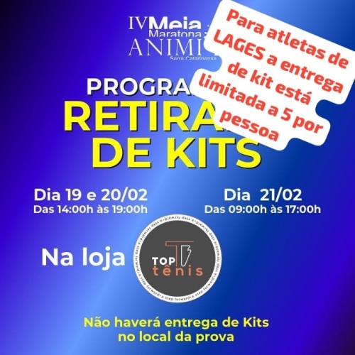 *NÃO HAVERÁ ENTREGA DE KIT NO DIA/LOCAL DA LARGADA* - Sendo SOMENTE Na Loja TOP TENIS, Rua Aristiliano Ramos, nº 36, Centro, Lages, SC- Nos dias 19 e 20 de FEVEREIRO/26: das 14:00h às 19:00h - No dia 21 de FEVEREIRO/26: das 09:30h às 17:00h |